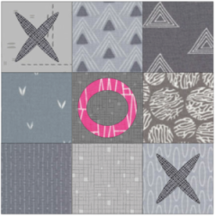 The Tic Tac Oh! Fabric & Pattern Kit includes laser-cut appliqués, nine gray fabrics, and a printed pattern — shipping included. GRAB THE KIT for only $7.99.